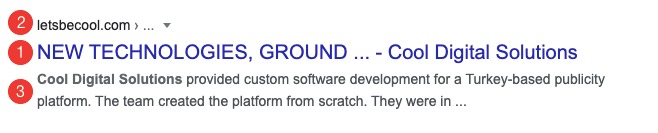 - Başlık: Sayfayı tanıtan başlıktır. Aranan anahtar kelimeyi içerir. Bu nedenle anahtar kelime konu ile alakalı olmalıdır. Diğer bileşenlere göre daha dikkat çekicidir.